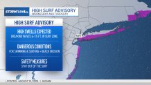 Space seashores are already dealing with a excessive rip present risk, primarily as a consequence of a robust northeast wind behind Sunday evening’s chilly entrance. Anticipate a excessive rip present risk for the rest of the week, particularly as Erin passes offshore on Thursday. The Nationwide Hurricane Heart advises “stay out of the water.”